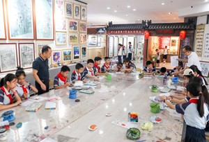 2023年7月18日,四川省华蓥市暑假中的小朋友在文创坊学习石画艺术。