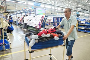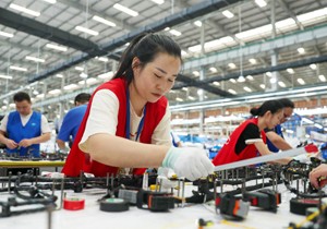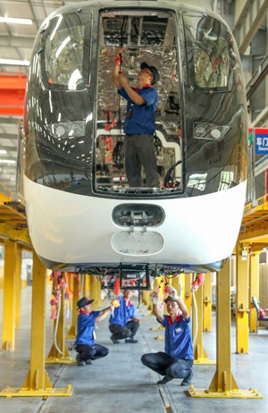 2023年7月23日,四川省广安市广安经济技术开发区一生产轨道交通设备的企业的员工,在生产线上紧张工作。 (邱海鹰)
