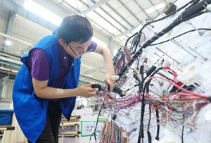 2023年7月23日,四川省广安市广安经济技术开发区一生产线束的企业的质检员,在检查订单产品质量。