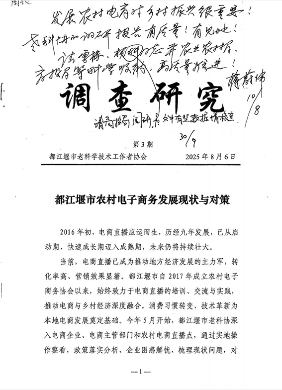近期,收到都江堰市委书记蒋蔚炜、市政府副市长杨科对市老科协《都江堰市农村电子商务发展现状与对策》分别作的批示。蒋蔚炜书记批示:“发展农村电商对乡村振兴很重要!老科协的调研报告有质量!有见地!”他希望有关领导、市农业农村局、市投促局等部门“科学吸纳,高质量推进!”