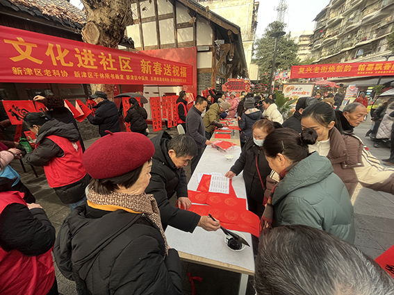 辞旧岁,墨香袅袅迎新春;纳吉福,红纸灼灼送温情。为深入学习贯彻落实区委十五届九次全会精神,持续做响“古蜀之源· 诗画新津”文旅品牌, 1月26日恰逢农历腊八节,一场“迎新年、送祝福”文化进社区活动,在“市井味、烟火气”的复兴街如期举行,书法老师义务为社区群众书写春联和“福”字,为大家送上最真挚的新春祝福。新津区老科协、区干休所书画工作室、五津街道老科协、寿阝江社区组织和承办了此次活动。