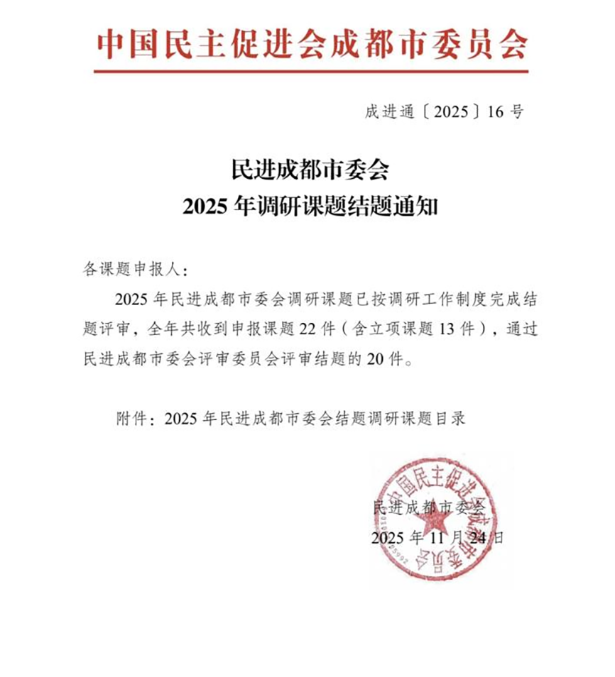 据了解,2025年民进成都市委会全年共收到申报课题22件(含立项课题13件),通过民进成都市委会评审委员会结题的20件。(孔孟文学院终身院士/子月图文报道)