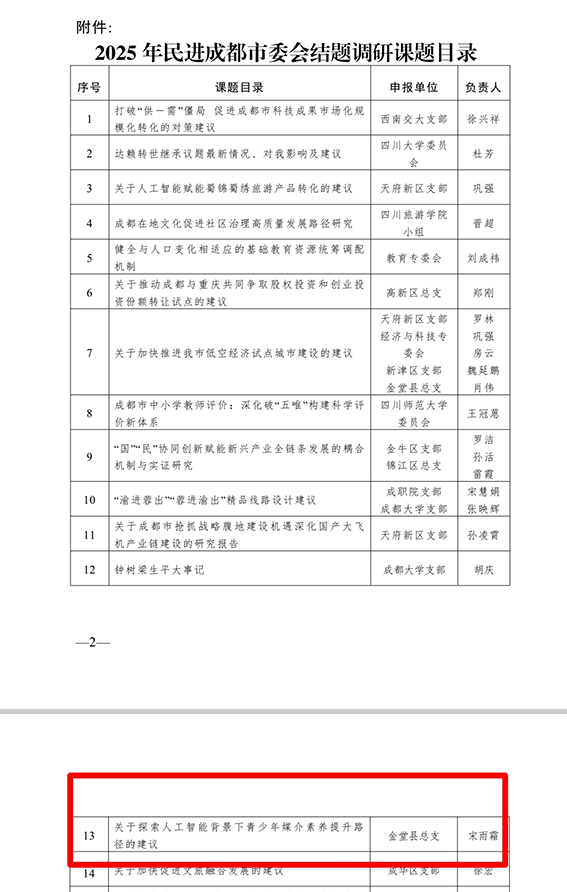 2025年上半年,在民进金堂总支指导和支持下,宋雨霜积极申报调研课题。她的研究生专业方向为新闻传播与文化研究,加之近年来对青少年教育的持续关注和研究实践,成功立项《关于人工智能背景下青少年媒介素养提升路径的建议》。