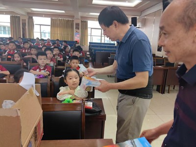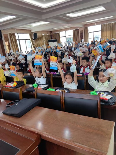 随后,一场充满爱意的物资捐赠仪式温暖展开。“五老”符军文等成员和学校老师们,带着满满的关怀与祝福,为留守儿童送上了精心准备的慰问品。有印着“沿心筑梦 关工同行”字样的笔记本,那一个个工整的字迹仿佛在诉说着对孩子们梦想的守护;崭新的书包,承载着知识的重量,也寄托着对孩子们未来的美好期许;实用的文具,将成为孩子们学习道路上的得力伙伴;还有象征着团圆与甜蜜的月饼,让孩子们在节日里感受到家的温暖。小易作为留守儿童代表上台发言,他稚嫩却坚定的声音,表达了对关工委和学校老师们的感激之情,也展现了留守儿童积极向上、勇敢面对生活的精神风貌。