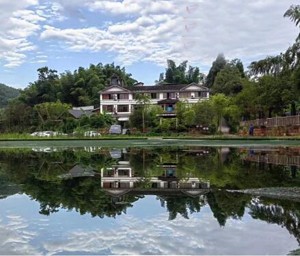 青山屋后摇翠竹,清雅悠静倒影真。