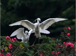 鹭巢雏乌母相伴,雪白双娇舞树梢。
