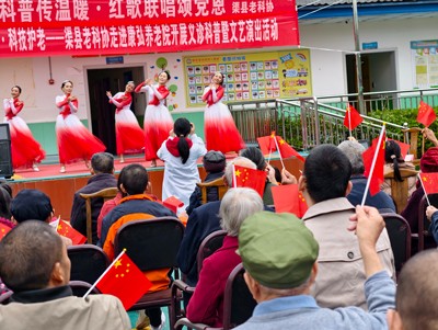 活动中,不仅有关怀身体的务实举措,更有慰藉心灵的文化盛宴。活动穿插了精彩的文艺汇演,舞蹈志愿者表演的《花开中国》、《看彩亭》等舞蹈,舞出了时代风采与地方韵味;深情款款的经典红歌《珊瑚颂》独唱,唤起了在场所有人的情感共鸣。活动在全体人员激昂共唱《没有共产党就没有新中国》、《社会主义好》、《东方红》等经典红歌,熟悉的旋律让老人们热泪盈眶,现场气氛达到高潮,歌声嘹亮,情感真挚,充分展现了老人们老有所乐、积极向上的精神风貌。