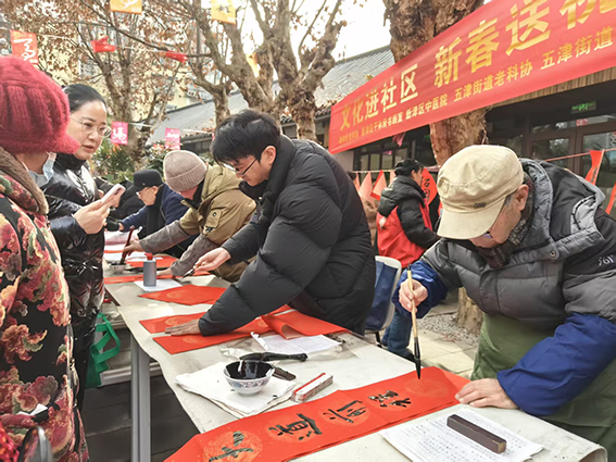 辞旧岁,墨香袅袅迎新春;纳吉福,红纸灼灼送温情。为深入学习贯彻落实区委十五届九次全会精神,持续做响“古蜀之源· 诗画新津”文旅品牌, 1月26日恰逢农历腊八节,一场“迎新年、送祝福”文化进社区活动,在“市井味、烟火气”的复兴街如期举行,书法老师义务为社区群众书写春联和“福”字,为大家送上最真挚的新春祝福。新津区老科协、区干休所书画工作室、五津街道老科协、寿阝江社区组织和承办了此次活动。