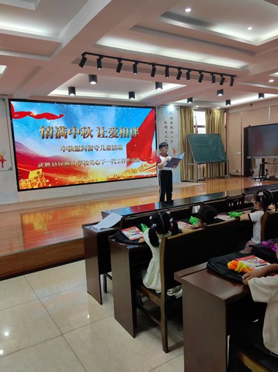 随后,一场充满爱意的物资捐赠仪式温暖展开。“五老”符军文等成员和学校老师们,带着满满的关怀与祝福,为留守儿童送上了精心准备的慰问品。有印着“沿心筑梦 关工同行”字样的笔记本,那一个个工整的字迹仿佛在诉说着对孩子们梦想的守护;崭新的书包,承载着知识的重量,也寄托着对孩子们未来的美好期许;实用的文具,将成为孩子们学习道路上的得力伙伴;还有象征着团圆与甜蜜的月饼,让孩子们在节日里感受到家的温暖。小易作为留守儿童代表上台发言,他稚嫩却坚定的声音,表达了对关工委和学校老师们的感激之情,也展现了留守儿童积极向上、勇敢面对生活的精神风貌。